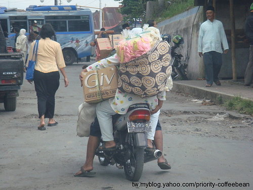 看不到騎士的摩托車版計程車,我只能說”殺",這在印尼的山上是很常見的計程車,能夠載的東西絕對超過你的想像。