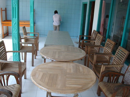 一早就出門,老媽的心願也達成了,又是在漁港,當然要休息一下,吃個早午餐吧,餐廳一角我娘正在洗手,準備大殺八方。