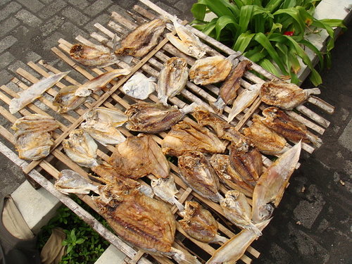 印尼漁港的特色,四處可見在曬魚乾,而且不管是多珍貴的魚,只要上岸沒有人買,都是一率曬魚乾,我有見過石斑&白鯧曬成魚乾,那這一盤你可以認出幾種魚,不過這不是此行的重點,所以並不重要,你就不用費心猜了,繼續看下去吧。