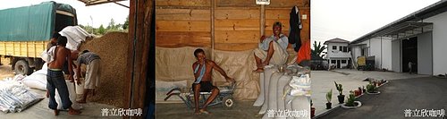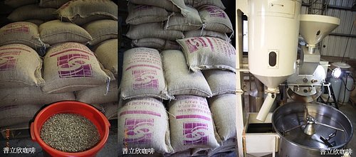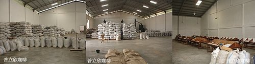 左圖是 普立欣咖啡 的咖啡篩選處理廠內,堆了滿滿的咖啡生豆,等著分級篩選