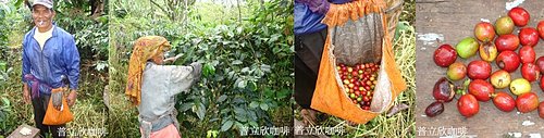 誰知杯中物,粒粒皆辛苦~~ 我們的上游契作農民,正辛苦的從咖啡樹上,一顆一顆的採摘垂涎欲滴的紅色咖啡櫻桃果 (圖中為特製的咖啡豆採收袋) 左上圖為大魯東鎮的街道,圖中為賣花生的攤子,花生在這邊可是名產呢,紅花生喔!!