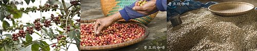 中圖是結實累累的曼特寧咖啡豆,海拔1,200公尺高的咖啡樹