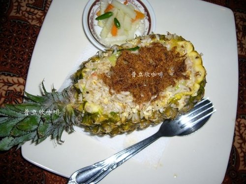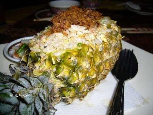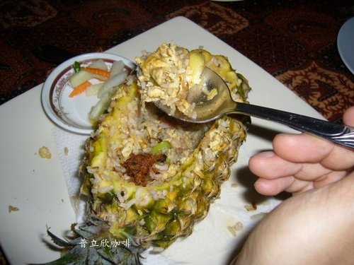 看到了吧,整顆鳳梨切開把炒好的飯放進去,不過飯裡面可沒有鳳梨喔。