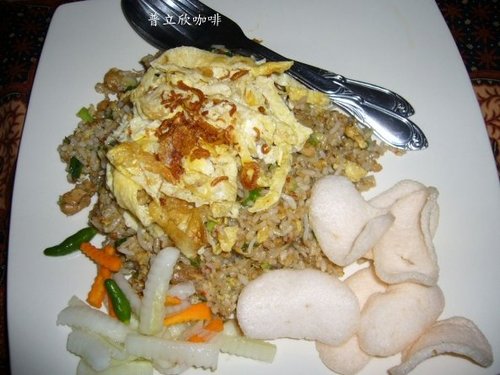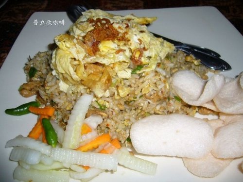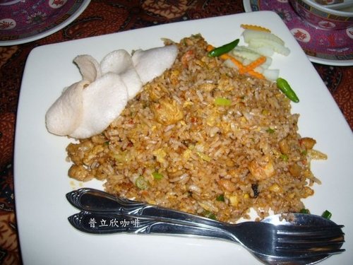 裡面有加上甜醬油及豆類跟雞肉當配料,旁邊就是蝦餅,有看到小顆的辣椒嗎?沒錯就是要咬一口辣椒配著飯吃,再多飯也吃的下~