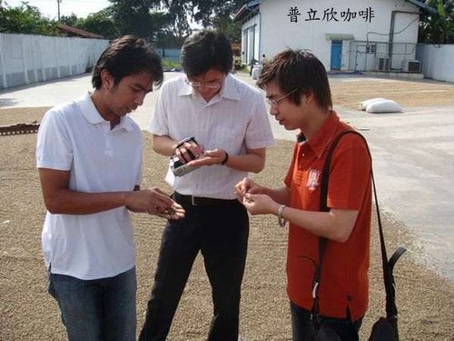 均勻的使力拉開成一排就像以前在曬稻穀般的景象,很"鄉村"跟品管討論這次的採收生豆狀況,因為每一次的採收都會因為天氣及土壤的變化而影響到咖啡生豆的品質我可不是在吃花生喔!!!是在剝開看豆子的韌度及顏色
