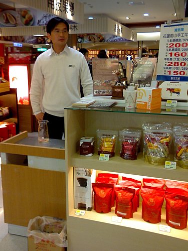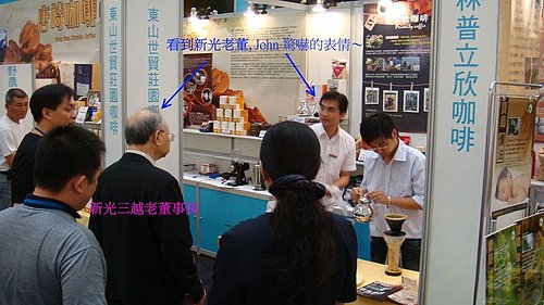當我仍在專心的沖泡時,突然新光三越的董事長走到普立欣咖啡的攤位前來,John措手不及的表情全寫在臉上.....