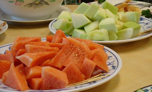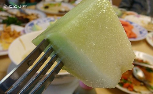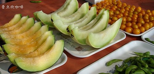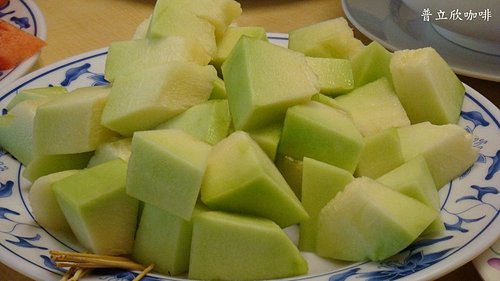 中午聚餐時特別又帶了一顆西瓜跟香瓜去,光擺放在盤子裡面口水就快流出來了~
