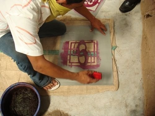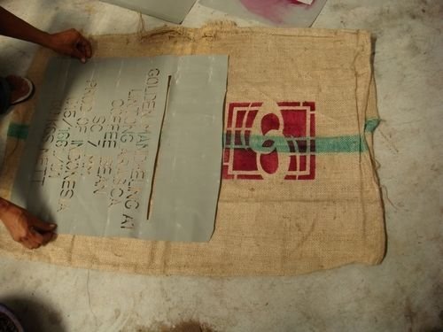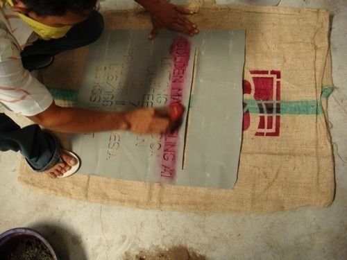 先把手工刻好的字板放上去袋子上面,然後用刷子刷。